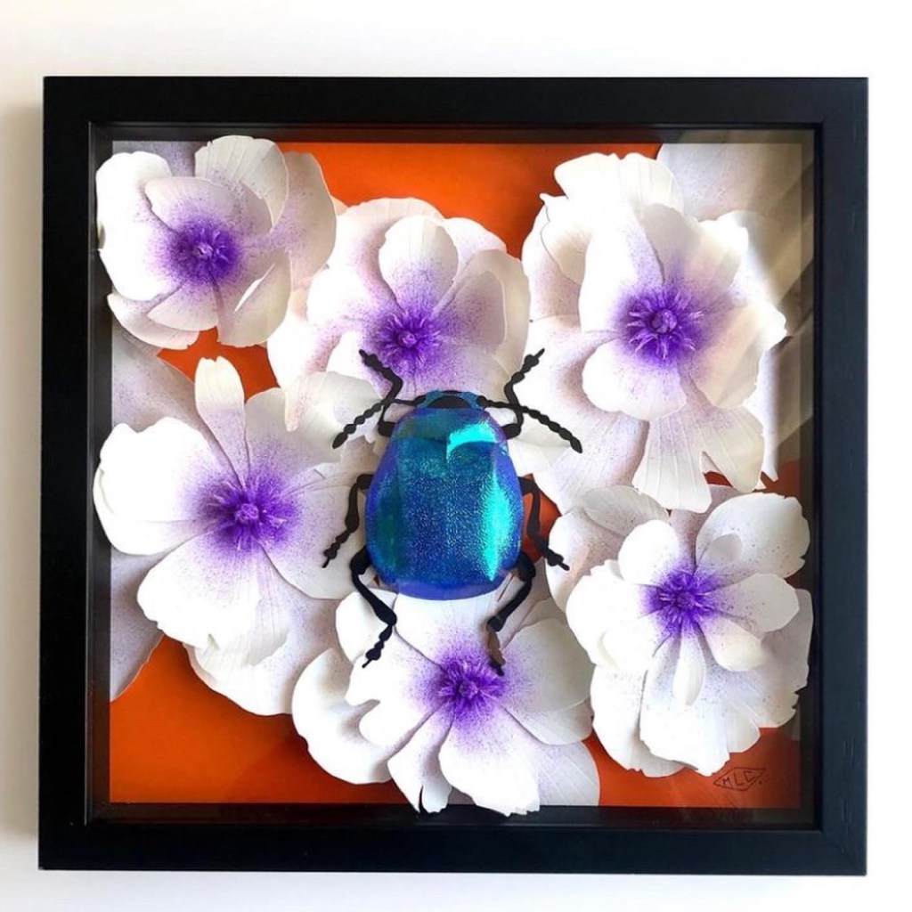Cadre 30 cm, fleurs et scarabée en papier. 315€