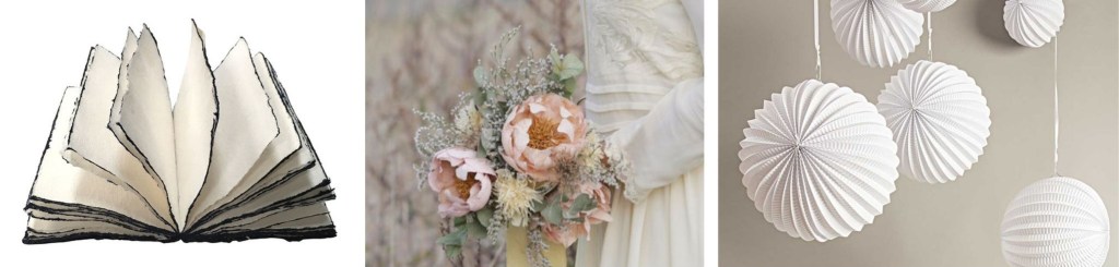 – Fleurs en papier (bouquet de la mariée, boutonnière, couronnes, décoration, centre de table…)