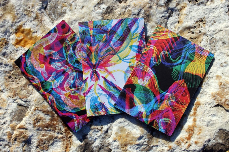 Principalement dans la nature car c’est dans ce milieu que j’aime évoluer, que j’aime voyager. Chaque collection est en rapport avec un lieu, un village où j’ai passé un peu de temps. Parfois j’arrive à ramener du papier, du tissu, ou d’autres matériaux dans mon sac à dos, mais sinon je traduis cela sous forme d’illustrations, inspirées par la faune, la flore, la forme d’un paysage, une couleur qui m’a marquée, une émotion ressentie, mes interprétations personnelles d’un voyage…