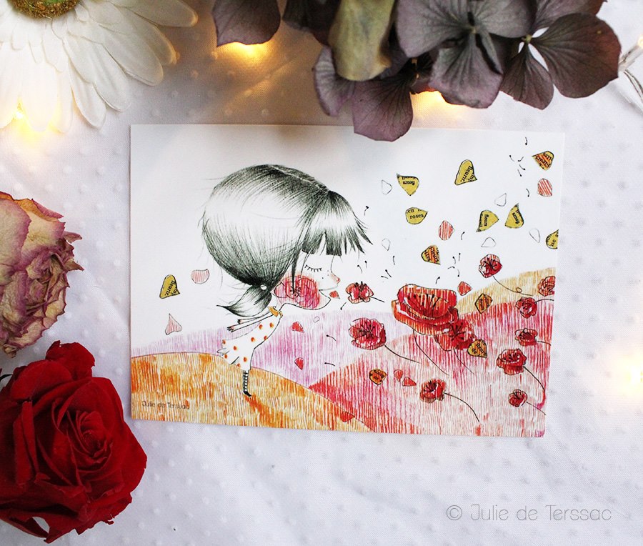 « Je suis une autodidacte, une vraie ! Je dessine depuis toute petite, et ai commencé à peindre à l’aquarelle vers mes 13 ans. Sans grande passion, finalement. Je n’ai jamais voulu en faire mon métier, ni suivre de formation d’art. J’ai donc suivi un cursus scientifique. J’ai peu à peu abandonné mes crayons pendant plusieurs années… Puis, mes études terminées en 2008, tout en cherchant du travail dans la chimie sans aucune conviction, j’ai repris les crayons et je ne les ai plus lâché depuis ! En 2011, j’ai sauté le pas : j’ai décidé d’arrêter ma carrière palpitante dans la chimie pour me mettre à mon compte et tenter de vivre de mon art. Pari gagné ! Depuis 2012 je suis également illustratrice jeunesse. »