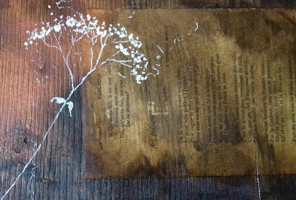 Ce sont de petits tableaux-objets sur bois et toiles où cohabitent et se superposent collages discrets de papier de soie et de pages de poésie, peinture, vernis et calligraphie.