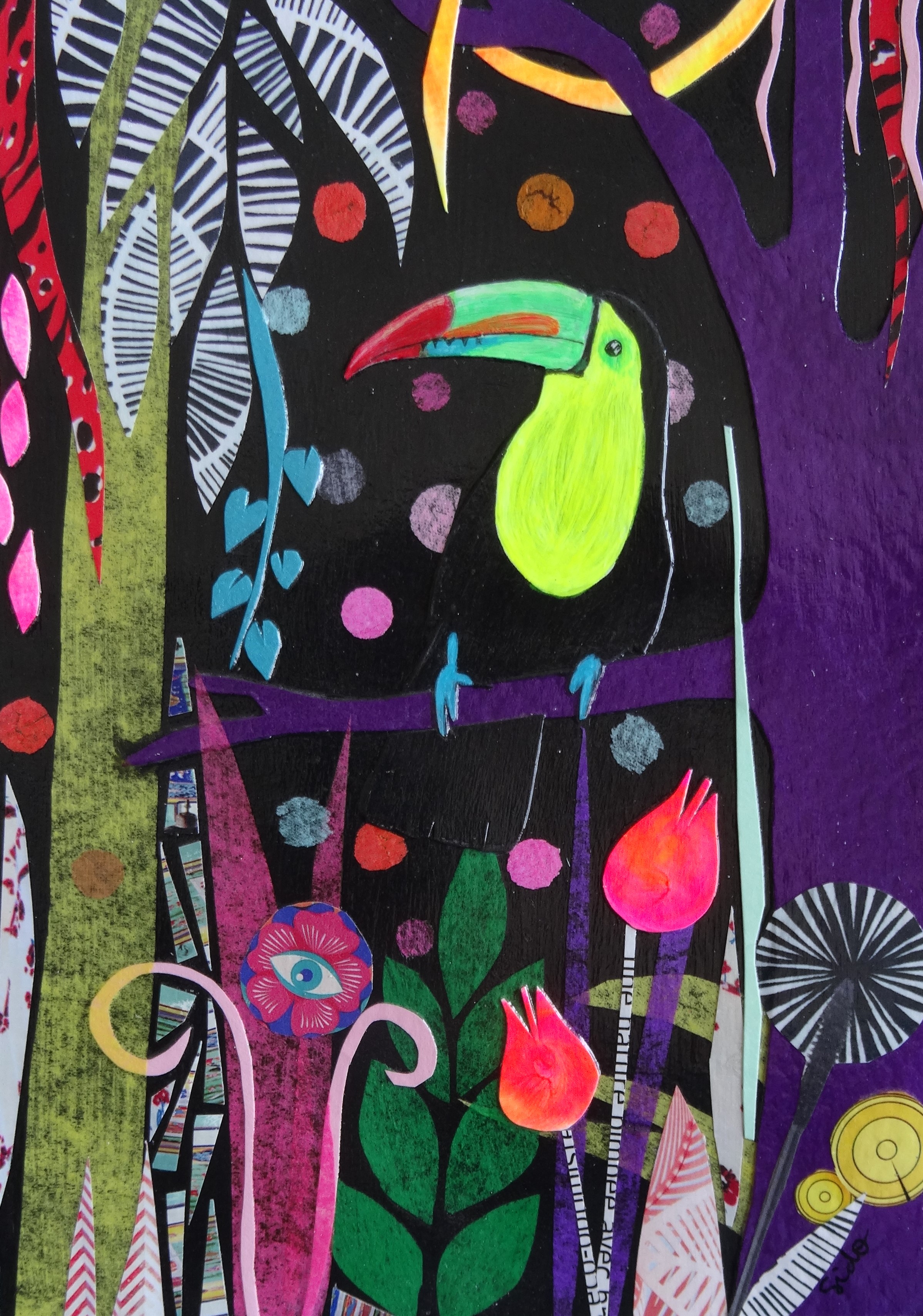 J’ai principalement 2 styles : les jungles composées de découpages très spontanés et les tableaux fragmentés plus