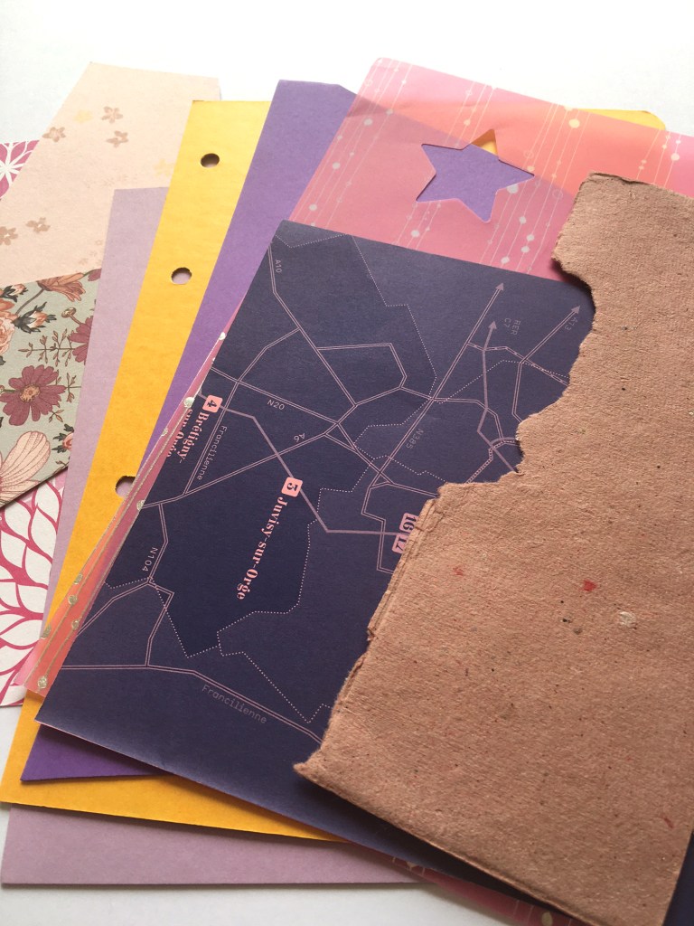 Papiers sous diverses formes et textures, bandes de chutes de papier. Chaque pochette est unique, confectionnée par harmonie de couleur.