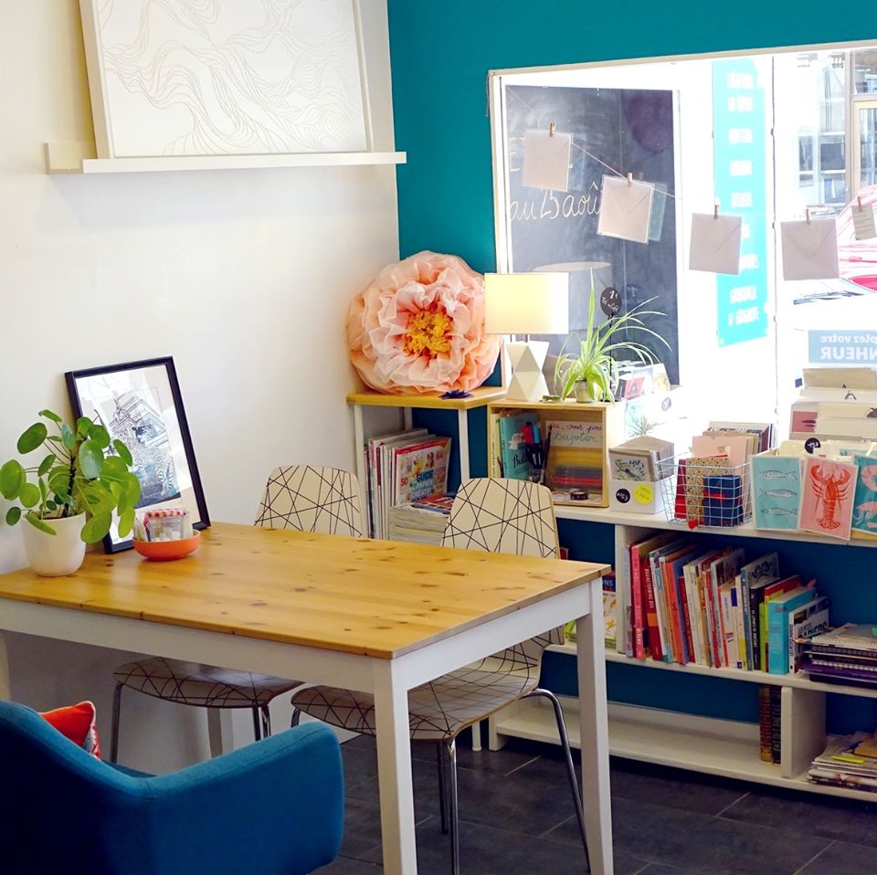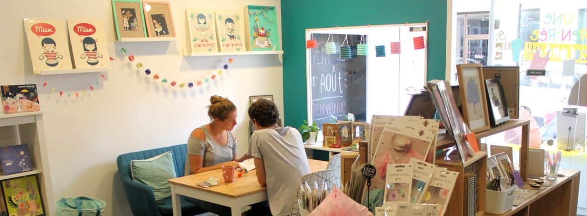 Parce qu’on a tous besoin de s’accorder une pause de temps en temps et que notre boutique atelier s’y prête particulièrement, on y a installé un mini salon de thé créatif, c’est le coin Gribouille & Grignote !