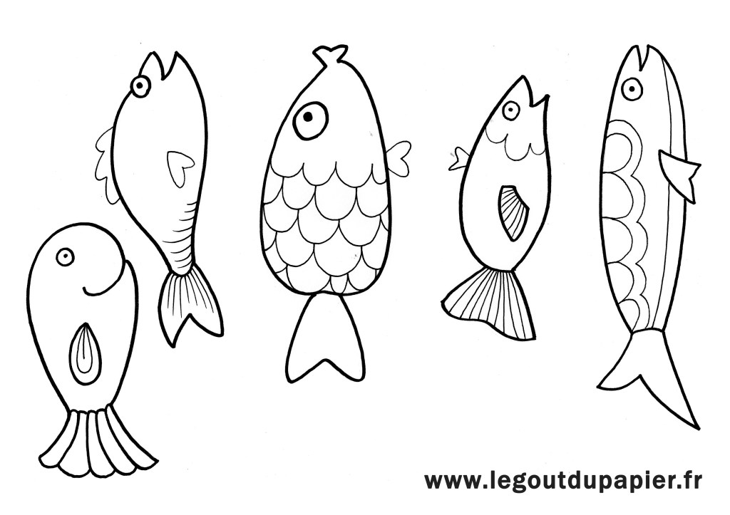 Voici quelques poissons rigolos dessinés par Jennifer à imprimer (cliquer pour agrandir puis faire un clic droit pour « enregistrer sous »), à découper et à colorier : tu peux ensuite en faire une guirlande pour en faire une jolie déco ou les coller dans le dos de tes parents sans te faire prendre… 😉