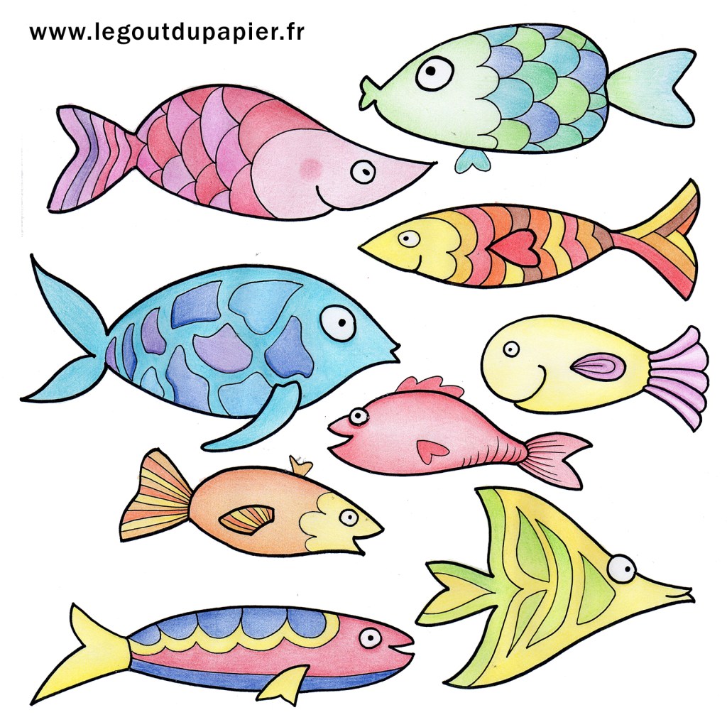 Et voici une version déjà en couleur, si tu veux imprimer des poissons tout prêt à découper :